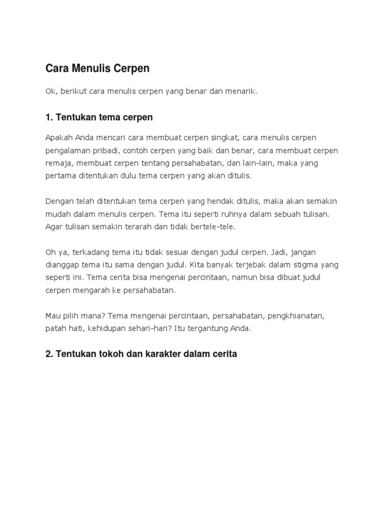 Cara menulis cerpen pengalaman pribadi yang baik yakni dengan membuat pembaca tertarik dengan menunjukkan proses atau kejadian yang spesifik daripada sekadar menarasikannya secara langsung. Di sisi lain ada banyak juga contoh kumpulan cerpen singkat dan menarik. Cerpen atau cerita pendek adalah jenis karya penulisan sangat populer dalam kehidupan kita sehari-hari yang dibuat dengan gaya bercerita yang unik dan menarik.
